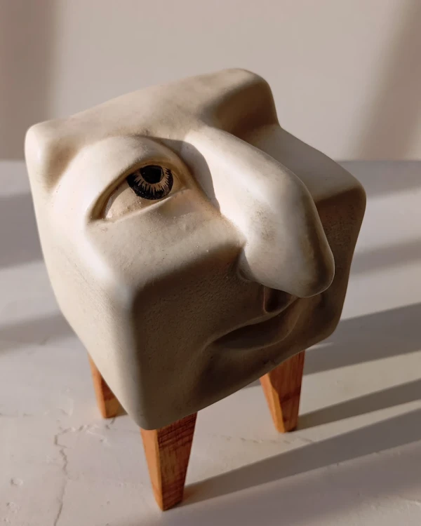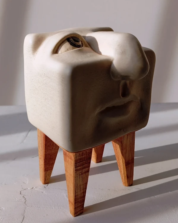 Pieza de ceramica con base de madera del ceramista Dario Fromer, esta obra forma parte de la reconocida coleccion del artista de diferentes retratos