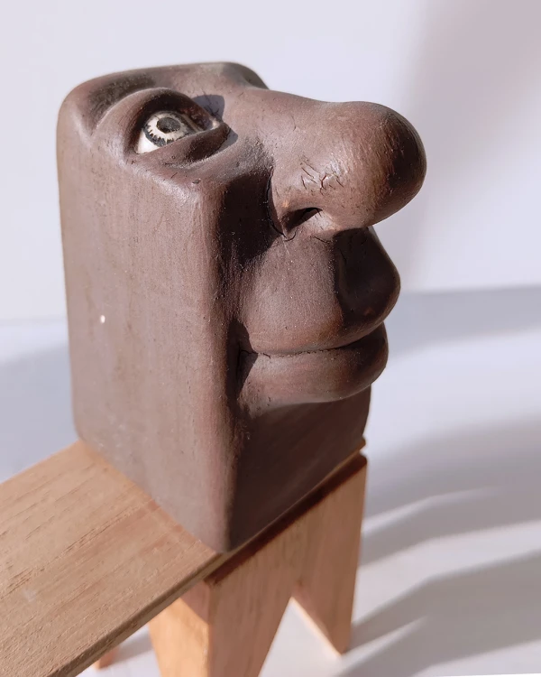 Pieza de ceramica con base de madera del ceramista Dario Fromer, esta obra forma parte de la reconocida coleccion del artista de diferentes retratos