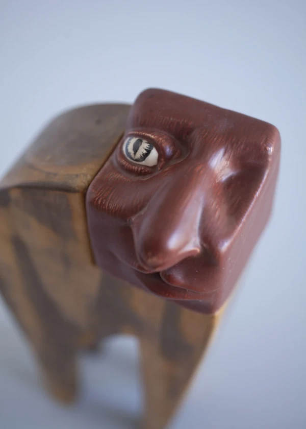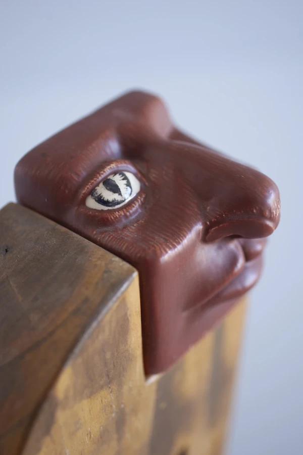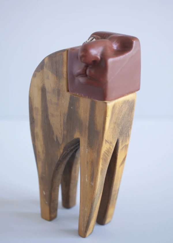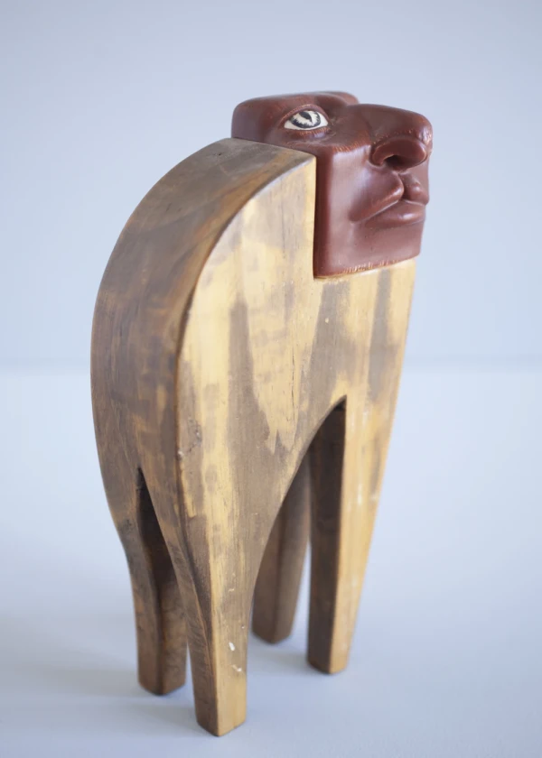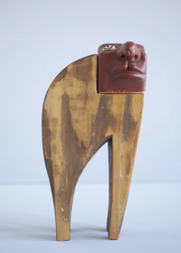 Materiales: Cuerpo de madera y cabeza de ceramica pintada con engobes y esgrafiada.