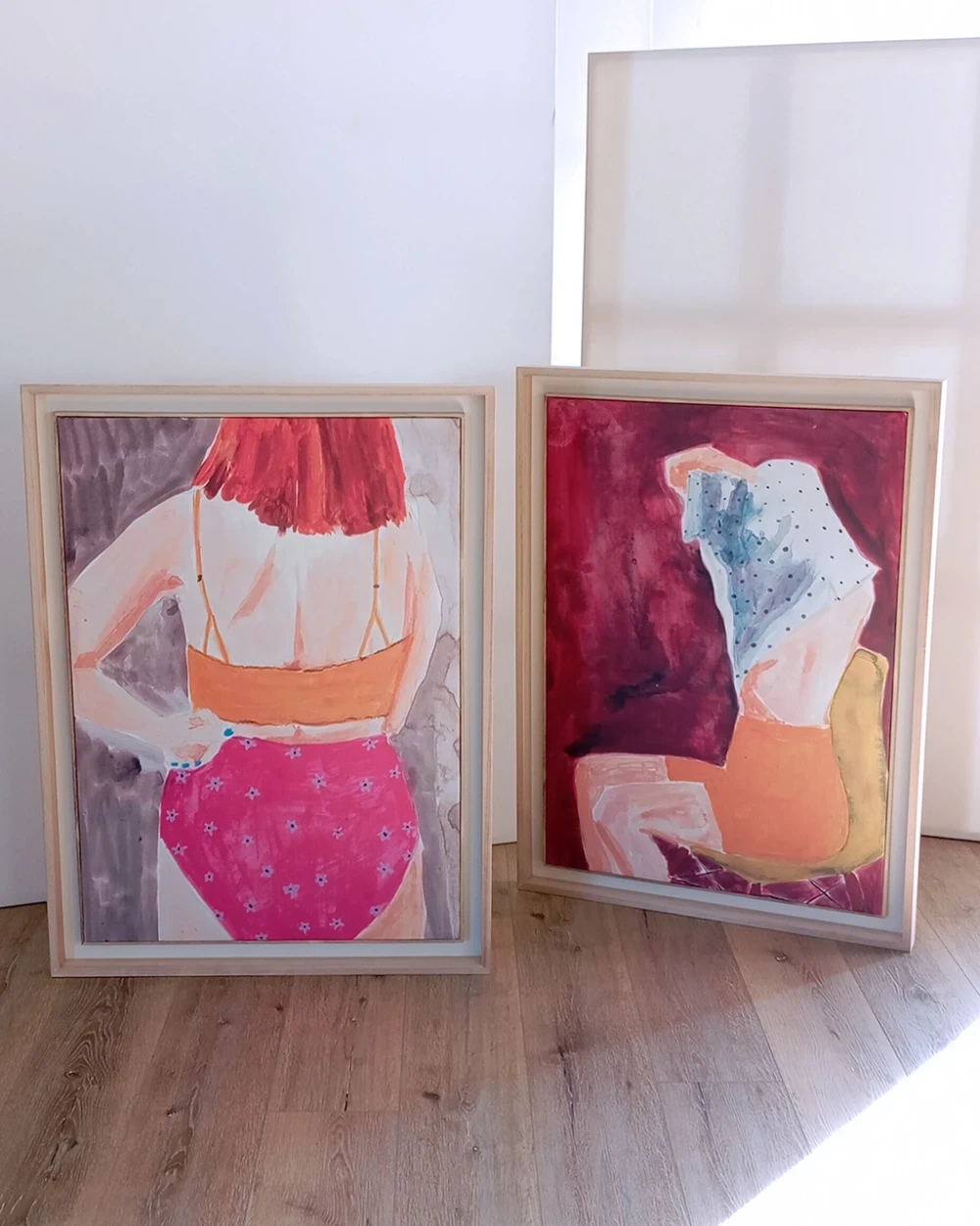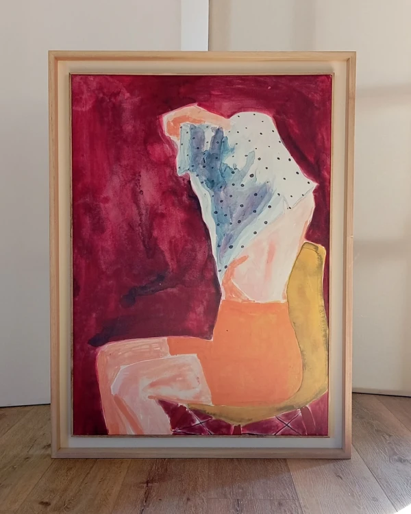Obra de Camila de Simone impresa en tela y enmarcada con doble marco de madera en caja con fondo blanco