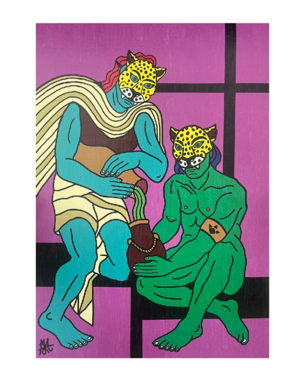 Dos Chamanes y una poción - Violeta / Marco Chato de 20x20 dorado a la hoja pequeño - 24 x 35cm