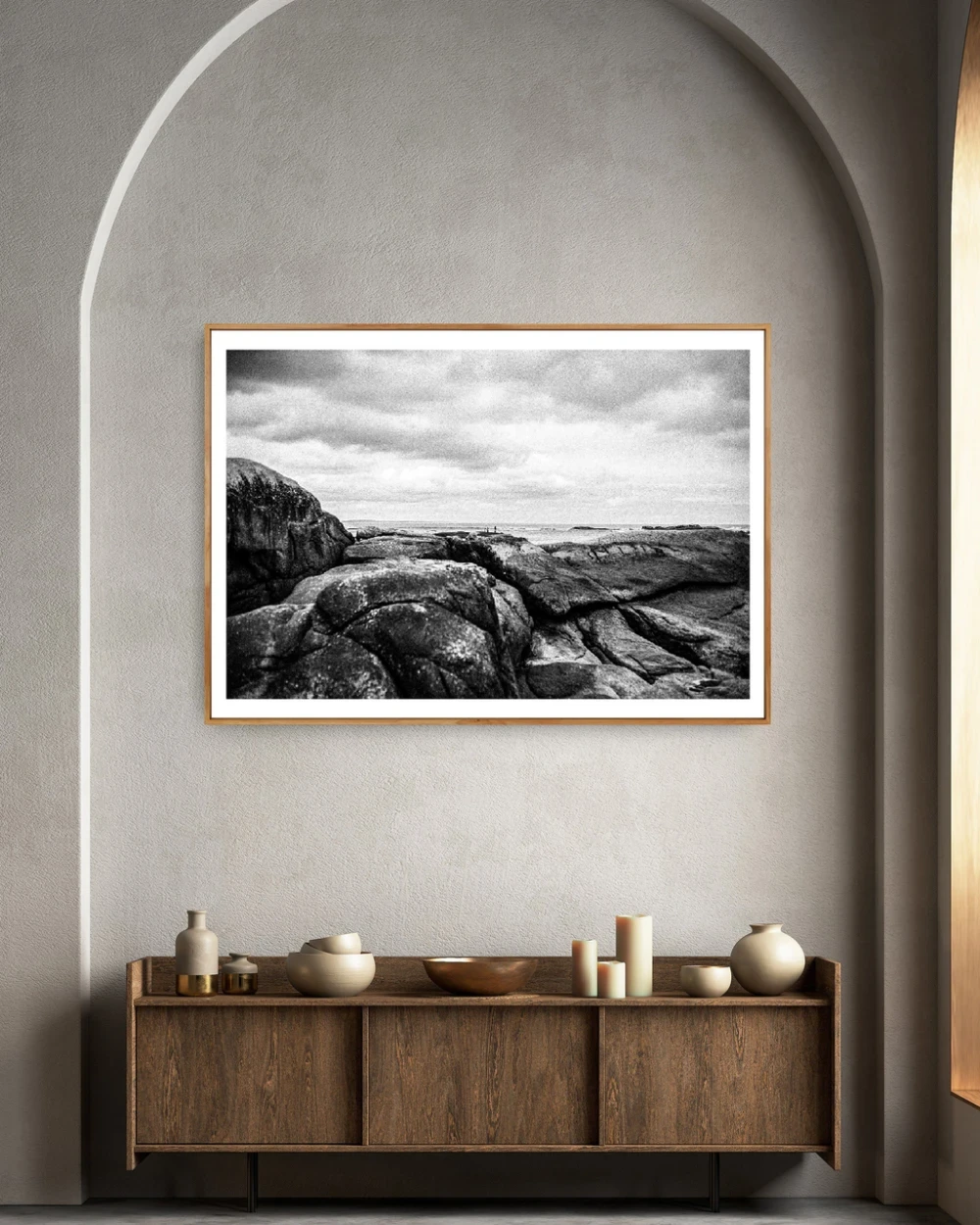 La foto esta enmarcada con marco en L recto mas 10 cm de passepartout por lado, podes elegir 3 medidas diferentes de impresion.