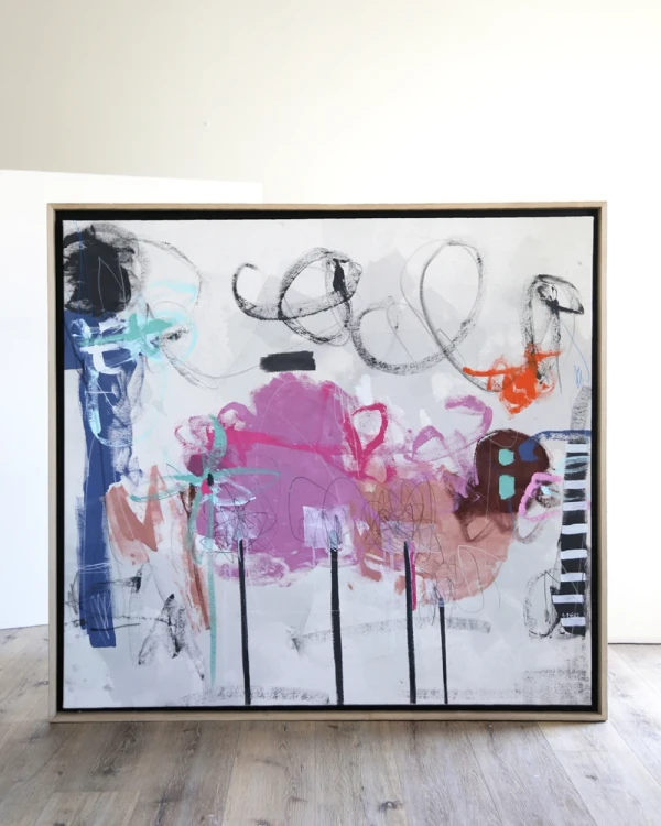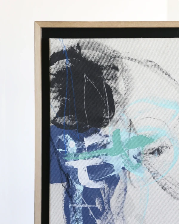 Obra original sobre tela de Gaby Perez enmarcada en cajita de madera kiri con fondo negro.