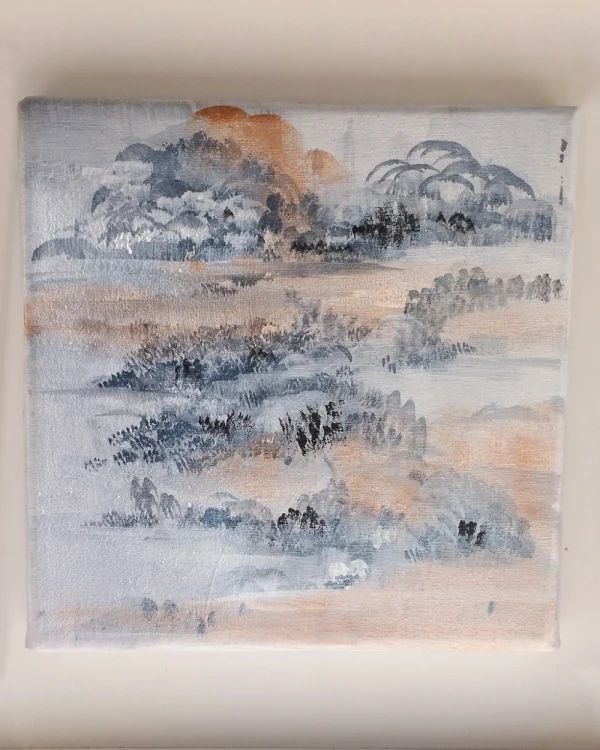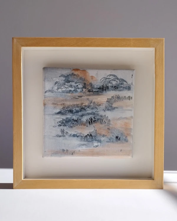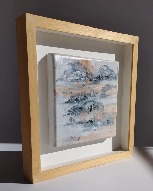 Obra orginal de Daniela Ramsfelder acrilico sobre tela en bastidor enmarcado en cajita con fondo blanco y varilla en madera listo para colgar