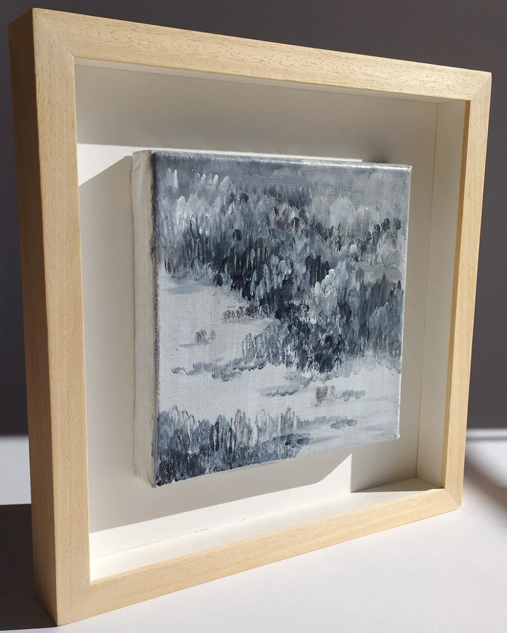 Obra orginal de Daniela Ramsfelder acrilico sobre tela en bastidor enmarcado en cajita con fondo blanco y varilla en madera listo para colgar
